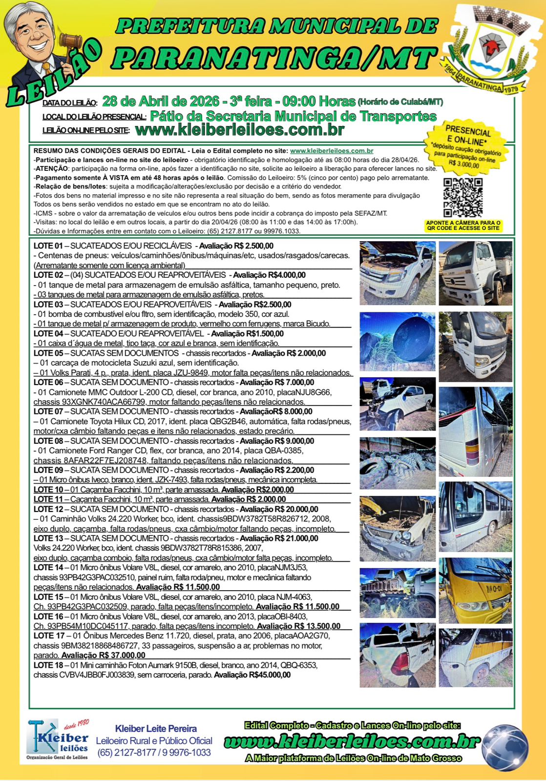 O leilão é conduzido pelo leiloeiro oficial Kleiber Leite Pereira e disponibiliza diversos lotes, incluindo carros, caminhões, ônibus, motocicletas, além de materiais reaproveitáveis e sucatas. Os valores de avaliação dos itens variam a partir de R$ 1.500, podendo chegar a até R$ 45 mil, dependendo do lote.